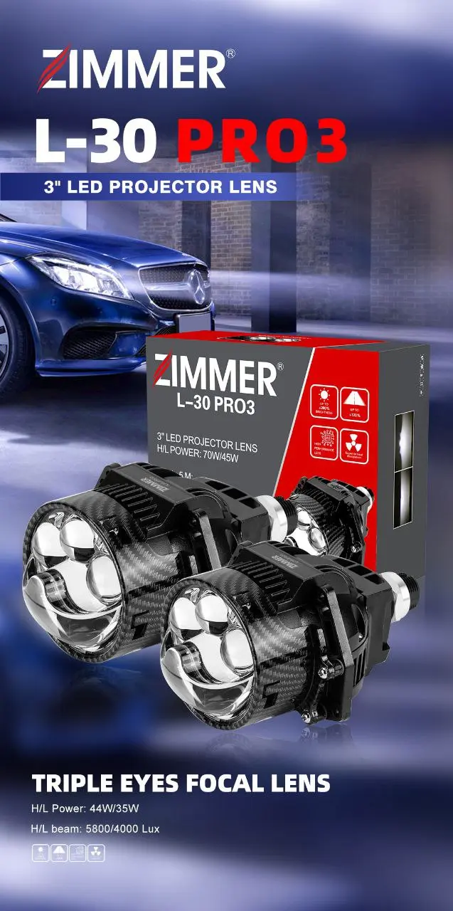 لنز L30-PRO3 سهچشم با بدنه کربن، توان 45W نور پایین و 70W نور بالا، مجهز به تیغه و 3 لیزر قوی؛ مناسب خودروهای با کاسه چراغ بزرگ